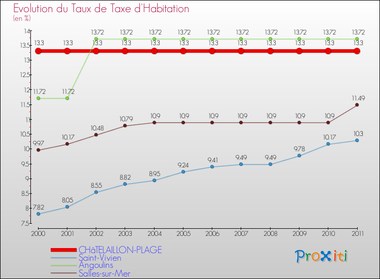En 2011, le taux de la taxe d'habitation vôté par le conseil municipal de Châtelaillon-Plage était de : 13.3 %.
