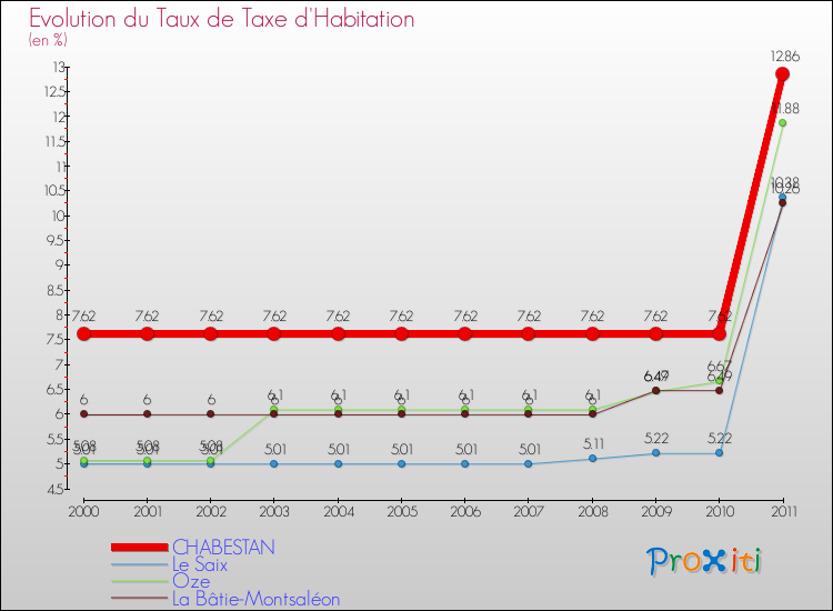 En 2011, le taux de la taxe d'habitation vôté par le conseil municipal de Chabestan était de : 12.86 %.