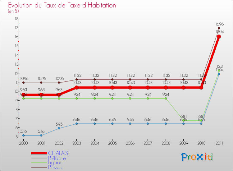 En 2011, le taux de la taxe d'habitation vôté par le conseil municipal de Chalais était de : 16.04 %.