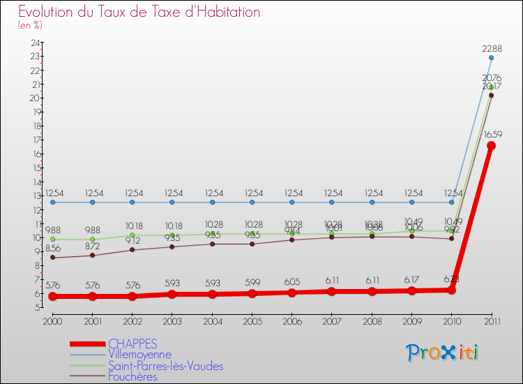 En 2011, le taux de la taxe d'habitation vôté par le conseil municipal de Chappes était de : 16.59 %.