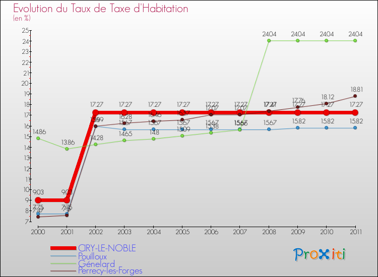 Le graphique ci dessous représente l'évolution du taux de la taxe d'habitation à Ciry-le-Noble depuis 2000.