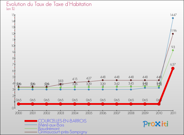En 2011, le taux de la taxe d'habitation vôté par le conseil municipal de Courcelles-en-Barrois était de : 6.37 %.