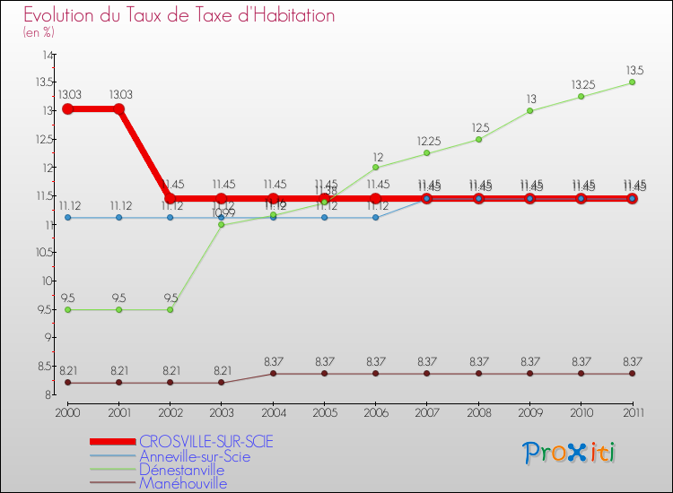 En 2011, le taux de la taxe d'habitation vôté par le conseil municipal de Crosville-sur-Scie était de : 11.45 %.