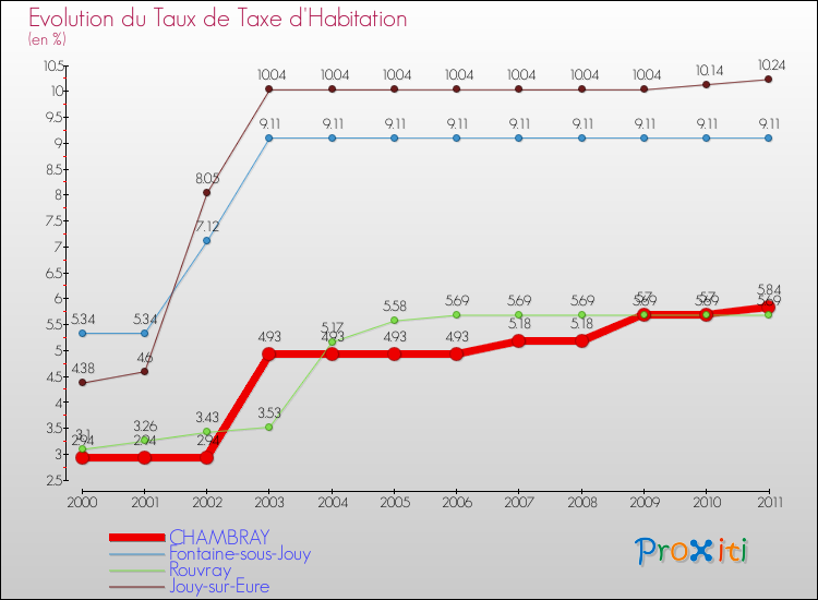 En 2011, le taux de la taxe d'habitation vôté par le conseil municipal de Chambray était de : 5.84 %.