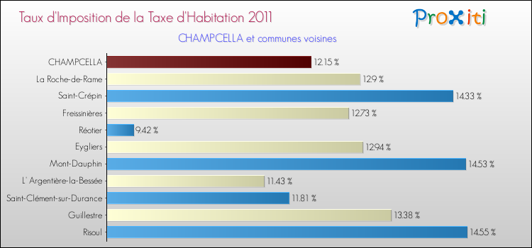 En 2011, le taux de la taxe d'habitation vôté par le conseil municipal de Champcella était de : 12.15 %.