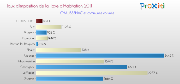 Vous trouverez ci-dessous des graphiques qui vous permettent de situer le taux de la taxe d'habitation de Chaussenac par rapport aux communes voisines.