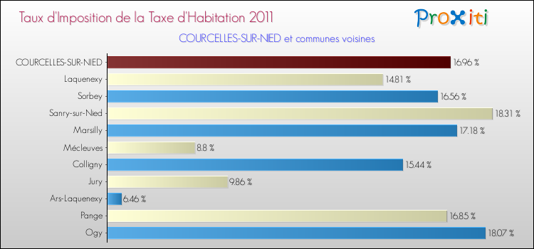 Vous trouverez ci-dessous des graphiques qui vous permettent de situer le taux de la taxe d'habitation de Courcelles-sur-Nied par rapport aux communes voisines.