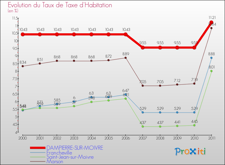 En 2011, le taux de la taxe d'habitation vôté par le conseil municipal de Dampierre-sur-Moivre était de : 11.21 %.