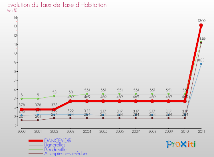 En 2011, le taux de la taxe d'habitation vôté par le conseil municipal de Dancevoir était de : 13.09 %.