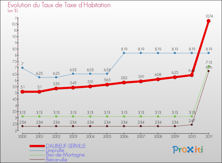 En 2011, le taux de la taxe d'habitation vôté par le conseil municipal de Daubeuf-Serville était de : 10.74 %.