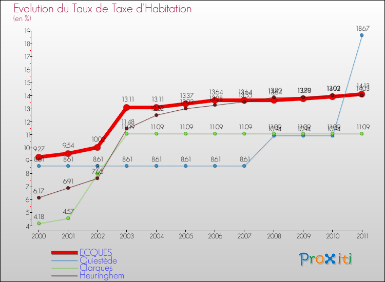 A Ecques, le taux de taxe d'imposition a ainsi augmenté de 52.43 % entre 2000 et 2011.