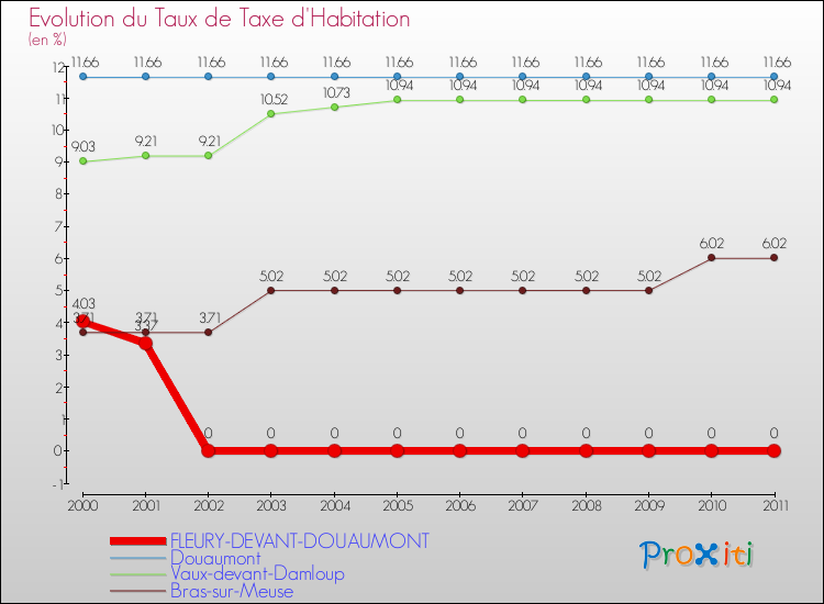 En 2011, le taux de la taxe d'habitation vôté par le conseil municipal de Fleury-devant-Douaumont était de : 0 %.