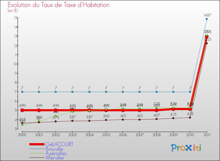 Le graphique ci dessous représente l'évolution du taux de la taxe d'habitation à Gélacourt depuis 2000.