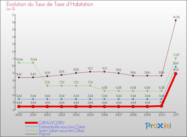 En 2011, le taux de la taxe d'habitation vôté par le conseil municipal de Girauvoisin était de : 8.93 %.