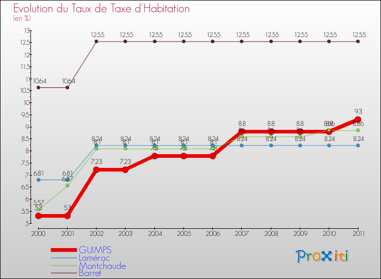 A Guimps, le taux de taxe d'imposition a ainsi augmenté de 75.47 % entre 2000 et 2011.