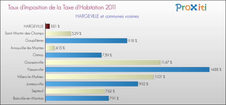 En 2011, le taux de la taxe d'habitation vôté par le conseil municipal de Hargeville était de : 3.81 %.