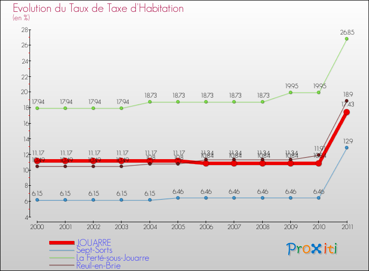 En 2011, le taux de la taxe d'habitation vôté par le conseil municipal de Jouarre était de : 17.43 %.