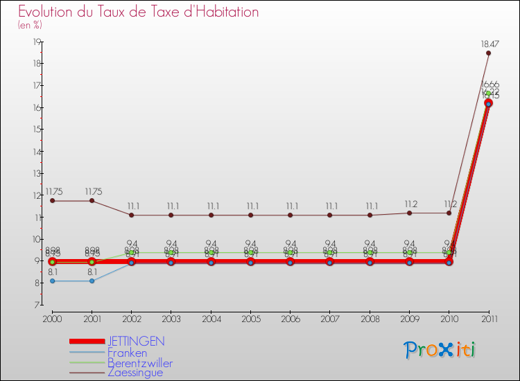 En 2011, le taux de la taxe d'habitation vôté par le conseil municipal de Jettingen était de : 16.22 %.