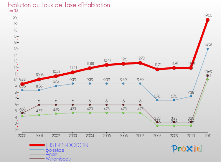 Le graphique ci dessous représente l'évolution du taux de la taxe d'habitation à L' Isle-en-Dodon depuis 2000.