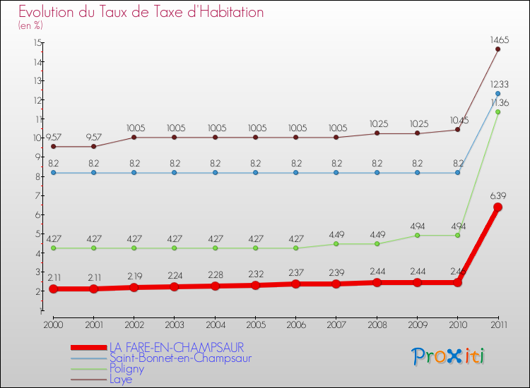 En 2011, le taux de la taxe d'habitation vôté par le conseil municipal de La Fare-en-Champsaur était de : 6.39 %.