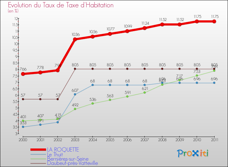 En 2011, le taux de la taxe d'habitation vôté par le conseil municipal de La Roquette était de : 11.75 %.