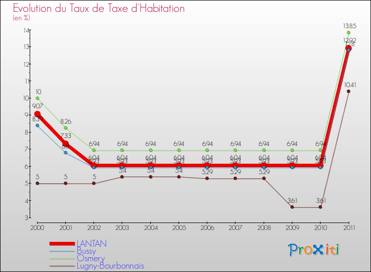 Vous trouverez ci-dessous des graphiques qui vous permettent de situer le taux de la taxe d'habitation de Lantan par rapport aux communes voisines.