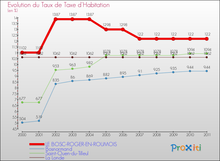 Le graphique ci dessous représente l'évolution du taux de la taxe d'habitation à Le Bosc-Roger-en-Roumois depuis 2000.