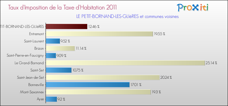 En 2011, le taux de la taxe d'habitation vôté par le conseil municipal de Le Petit-Bornand-les-Glières était de : 12.46 %.