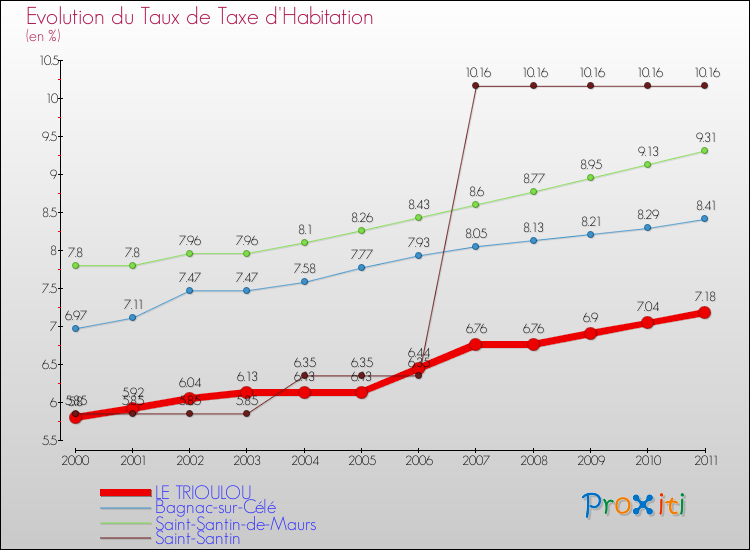 En 2011, le taux de la taxe d'habitation vôté par le conseil municipal de Le Trioulou était de : 7.18 %.
