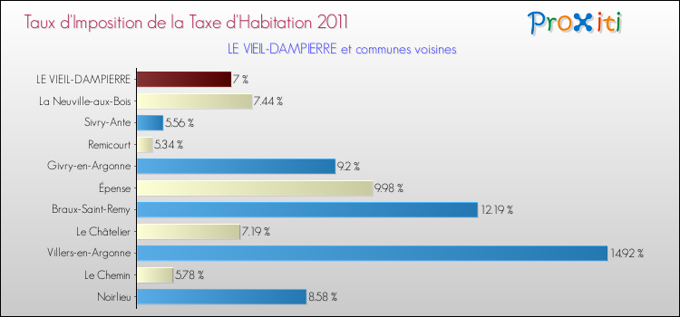 En 2011, le taux de la taxe d'habitation vôté par le conseil municipal de Le Vieil-Dampierre était de : 7 %.