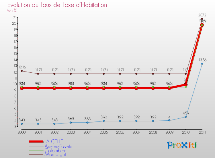 En 2011, le taux de la taxe d'habitation vôté par le conseil municipal de La Celle était de : 19.73 %.