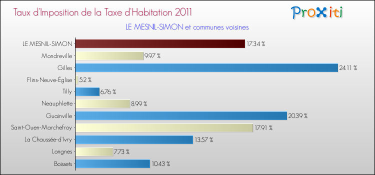 En 2011, le taux de la taxe d'habitation vôté par le conseil municipal de Le Mesnil-Simon était de : 17.34 %.
