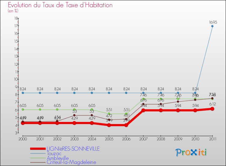 En 2011, le taux de la taxe d'habitation vôté par le conseil municipal de Lignières-Sonneville était de : 6.12 %.