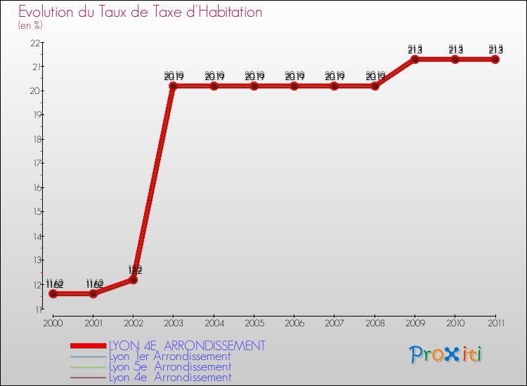 En 2011, le taux de la taxe d'habitation vôté par le conseil municipal de Lyon 4e Arrondissement était de : 21.3 %.