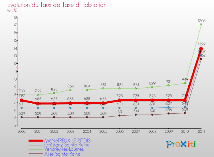 Etant donné cette hausse qui fausse quelque peu la donne, nous présentons ci dessous l'évolution du taux de taxe d'habitation sur la période 2000-2010, et non 2000-2011 :