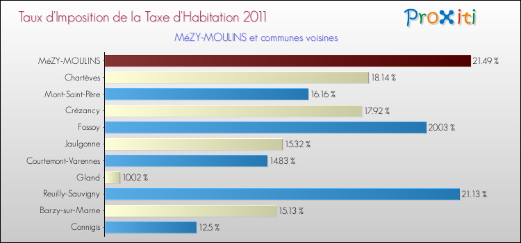 Vous trouverez ci-dessous des graphiques qui vous permettent de situer le taux de la taxe d'habitation de Mézy-Moulins par rapport aux communes voisines.