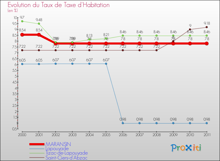 A Maransin, le taux de taxe d'imposition a ainsi baissé de 8.67 % entre 2000 et 2011.