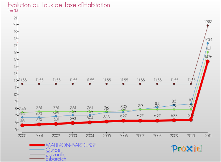 A Mauléon-Barousse, le taux de taxe d'imposition a ainsi augmenté de 14.11 % entre 2000 et 2010.