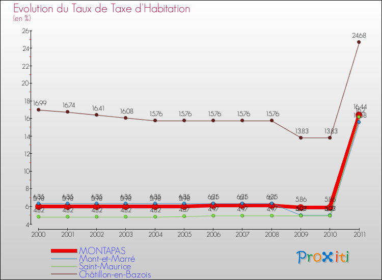 Le graphique ci dessous représente l'évolution du taux de la taxe d'habitation à Montapas depuis 2000.