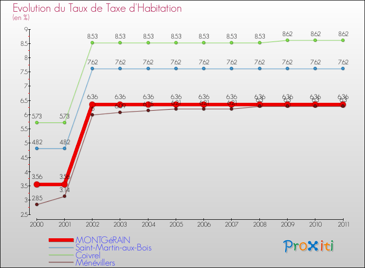 En 2011, le taux de la taxe d'habitation vôté par le conseil municipal de Montgérain était de : 6.36 %.