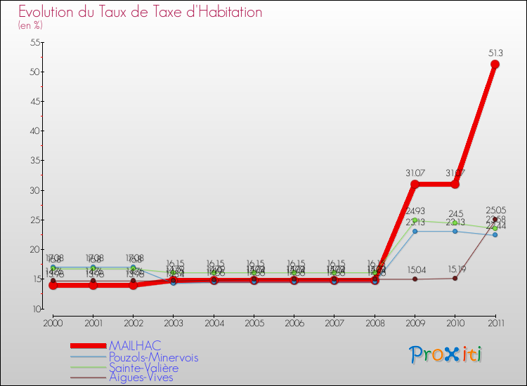 En 2011, le taux de la taxe d'habitation vôté par le conseil municipal de Mailhac était de : 51.3 %.