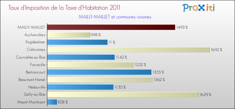 En 2011, le taux de la taxe d'habitation vôté par le conseil municipal de Mailly-Maillet était de : 14.93 %.