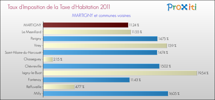 En 2011, le taux de la taxe d'habitation vôté par le conseil municipal de Martigny était de : 11.24 %.