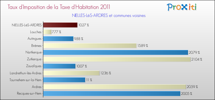 Vous trouverez ci-dessous des graphiques qui vous permettent de situer le taux de la taxe d'habitation de Nielles-lès-Ardres par rapport aux communes voisines.