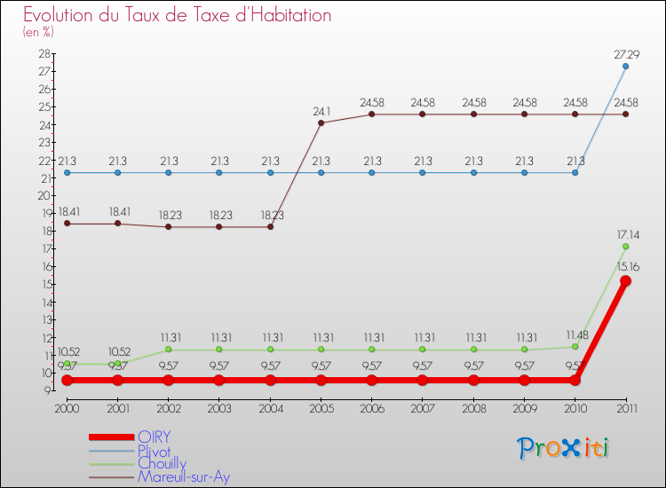 En 2011, le taux de la taxe d'habitation vôté par le conseil municipal de Oiry était de : 15.16 %.