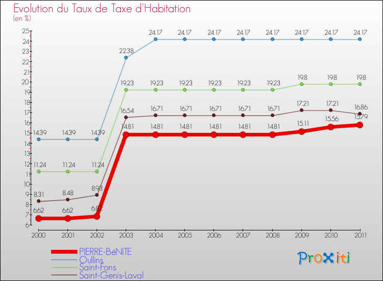 En 2011, le taux de la taxe d'habitation vôté par le conseil municipal de Pierre-Bénite était de : 15.79 %.