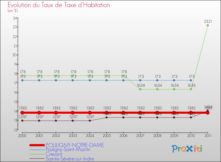 En 2011, le taux de la taxe d'habitation vôté par le conseil municipal de Pouligny-Notre-Dame était de : 13.82 %.