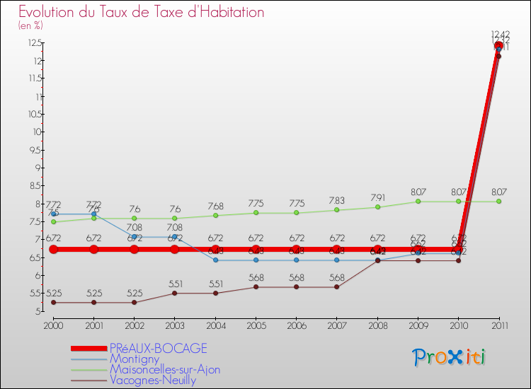 Le graphique ci dessous représente l'évolution du taux de la taxe d'habitation à Préaux-Bocage depuis 2000.