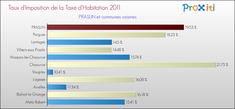 En 2011, le taux de la taxe d'habitation vôté par le conseil municipal de Praslin était de : 19.53 %.