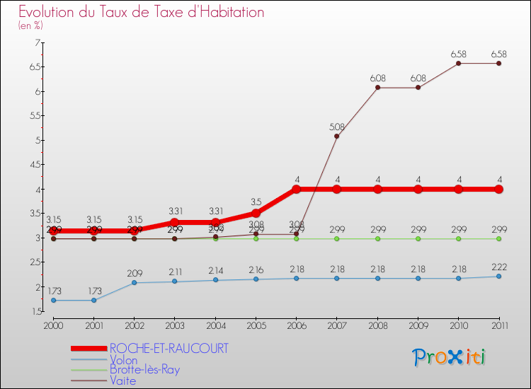 Le graphique ci dessous représente l'évolution du taux de la taxe d'habitation à Roche-et-Raucourt depuis 2000.